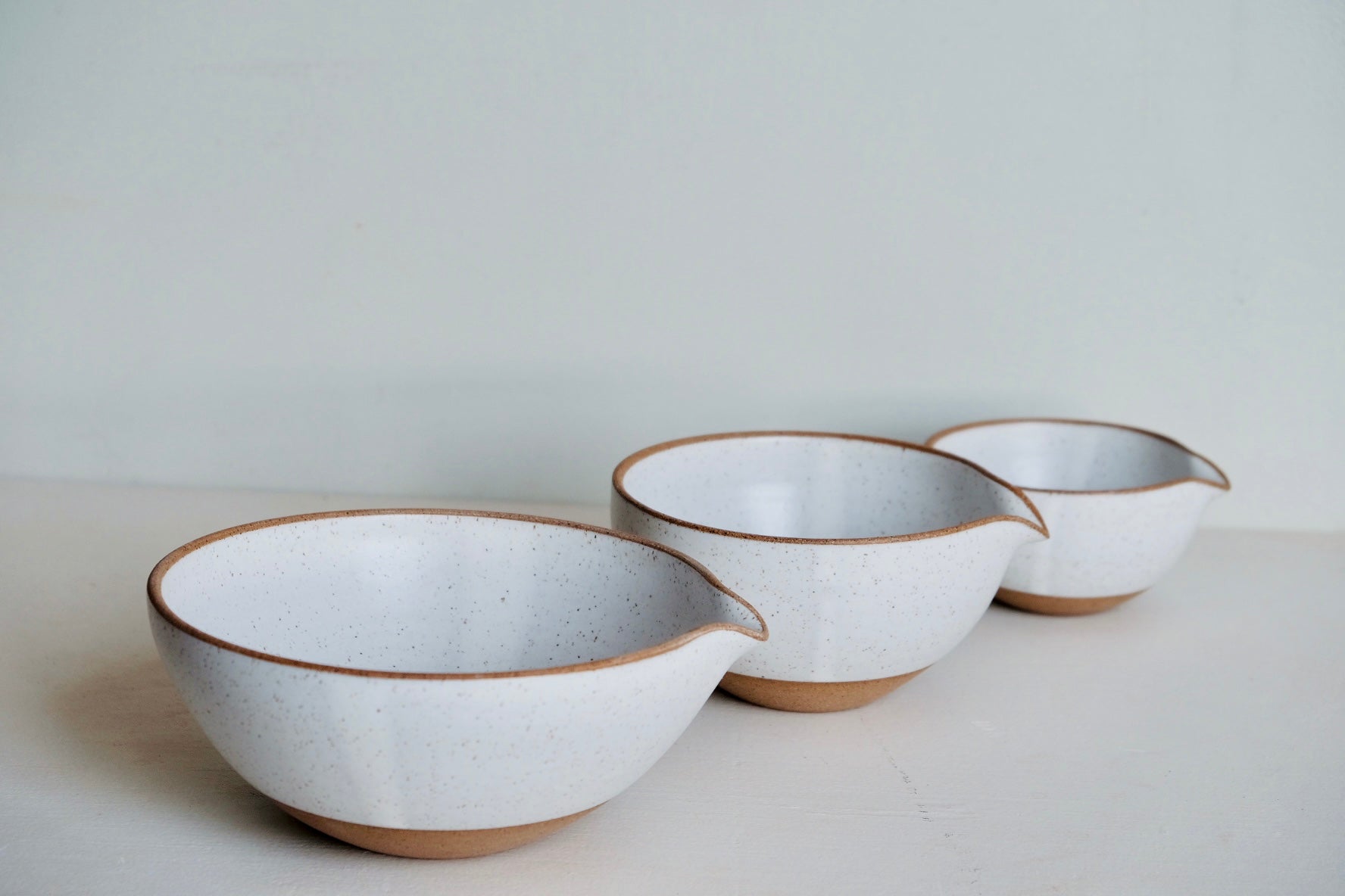 This large ceramic mixing bowl comes with a handy lip that makes pouring easier. It also nests well with its small and medium counterparts for easy storage.